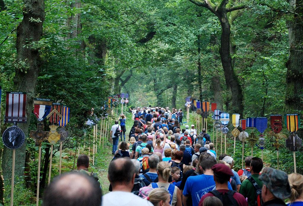 Arts maakt een ongeveer achthonderd meter lang project met als start aan weerszijden van de weg opgeblazen levensgrote zwart-wit foto’s van vrouwen en kinderen die hun bevrijders toejuichen aan het eind van WOII. Daarbij was het geluid van juichende en klappende mensen te horen. Hierdoor werd iedere wandelaar die hier tussendoor liep als een held begroet. De route daarna was voorzien van uitvergrote medailles op drie meter hoge stokken waardoor de wandelaars door een erehaag liepen. Aan het eind daarvan werd een grote foto van een hedendaags juichend stadionpubliek getoond met dito geluid.