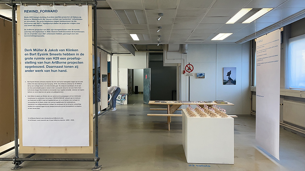 Vanwege corona werd de Airborne wandeltocht dit jaar niet gelopen en was er een kennismaking met het werk van de geselecteerden kunstenaars Bart Eysink Smeets en Müller & Van Klinken. Naast een proefopstelling van de schetsontwerpen toonden zij ander werk van hun hand. In de Filmzaal en de Blauwe Kamer was een overzicht in foto’s en films van 12 jaar ArtBorne projecten te zien.