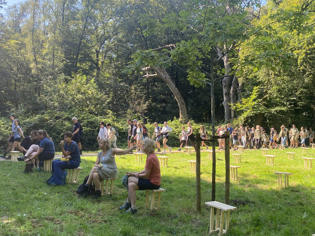 Voor de wandelaars betekent Rustplaats in eerste instantie ‘even uitrusten’ tijdens de wandeltocht. Maar de militaire opstelling van meer dan 300 uniforme krukjes – in rijen en op manslengte afstand – legt een link naar de grafstenen op de Airborne begraafplaats. Dat werd versterkt door een geluidscompositie van Ishtar Bakhtali. De grafstenen markeren de laatste rustplaats van gesneuvelde militairen uit WOII. Zij hadden de moed om hun leven te geven waardoor wij in vrijheid kunnen leven. De wandelaars werden uitgenodigd om plaats te nemen en de slachtoffers te gedenken, zowel die van WOII als van de oorlogen die nu wereldwijd woeden. Het project stond aan de Dunolaan op landgoed de Duno.