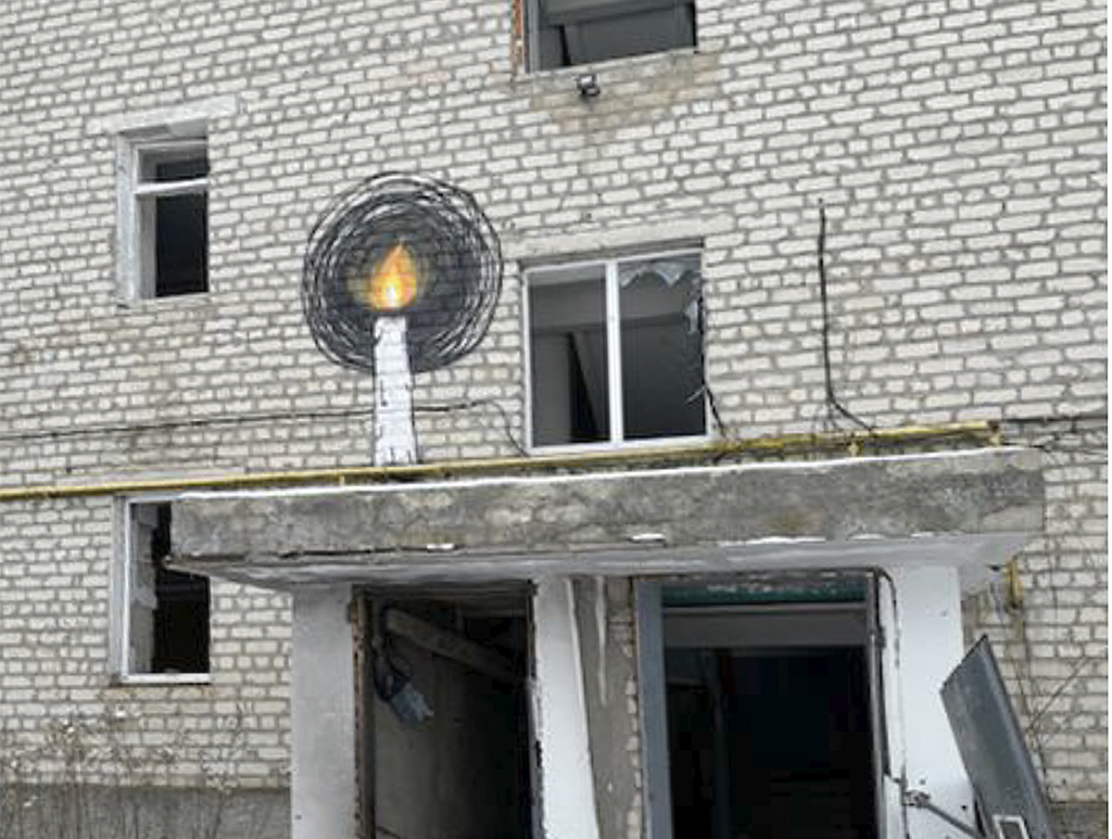Een enorme ruïne rijst op in het bos. Achter deze entree hangen foto’s van verwoeste gebouwen uit WOII en uit de Oekraïne oorlog.