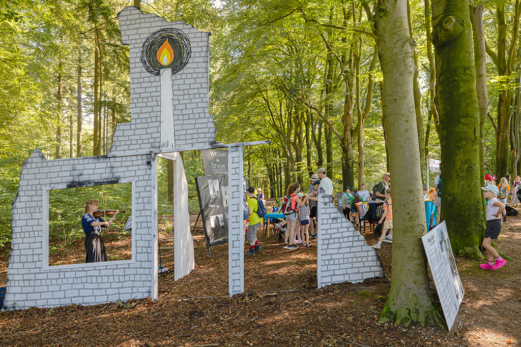 Een enorme ruïne rijst op in het bos. Achter deze entree hangen foto’s van verwoeste gebouwen uit WOII en uit de Oekraïne oorlog.